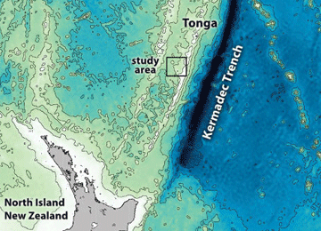 Dr Rebecca Carey from the University of Tasmania has invited us to join a team to explore a remarkable underwater volcano from the 27th March to 17th April. Through daily reports and photos, and by connecting with the scientists on board the research ship you can become part of scientific history in the making. Havre submarine volcano is located within a chain of submarine volcanoes that extends to the northeast of New Zealand (fig.1).