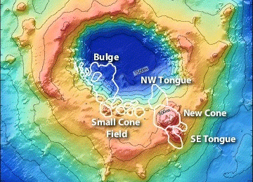 The map of the new 2012 eruption products on Havre volcano show multiple new features, large and small volcanic cones, ‘tongues’ of volcanic material gain extending from the New Cone, and a ‘bulge’ of material in the west of the volcanoes summit (fig 3).