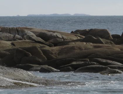 This morning I looked out the tent and wondered if I should just stay in bed. The easterly was raging and the white caps looked messy. Hmm, might not get any better... I edged into the fray with the bow crashing into the waves. Just past Dead Man's Cove the current moved in to the coast making it even more jumbled and peaky. Paddling past the first headland I could steer a more northwest course and pop the sail up. It had mixed results. I shot across the water at a blistering pace but lurched uneasily in the gusty conditions. It was a wild ride as I rounded Cape Rochon and into relative calm. The wind, still strong, now came from directly behind and the waves weren't rebounding back towards me. I used the paddle to keep balance but just let the wind carry me forward. A red cray fishing boat was laying pots as I rounded North West Cape and the wild ride was over. I paddled into the nearest sandy bay on Ranger Point and set up camp right on the beach. Looking out the tent door I can see straight across to the northern tip of Hunter Island and beyond that to Albatross Island. Even from here, 5-6 kms away, I can see whitewater bouncing off the end of Hunter Island so it must be woeful on Cape Keraudren. It'll need to be much calmer weather to venture further west to the island at the center of this whole expedition. Tomorrow I'll sneak down to meet Bev and John who live here on Three Hummock Island.