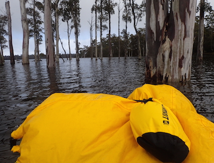 The first section was a series of whitewater rapids, probably the steepest I'll paddle down. With all my gear in the sides of the raft and little bit left to strap onto the top in my pack (yellow bag), off we went. I'll be honest and admit that I was mostly out of control and bounced through the rapids with my heart in my mouth. Alex was expecting me to follow his lead and pull into quiet patches of water between the rough bits but once I started there was no stopping. I shot past and led us on a wild ride until the water smoothed and calmed down. The fast flow continued under Derwent Bridge and finally slowed to flat water in Lake King William.