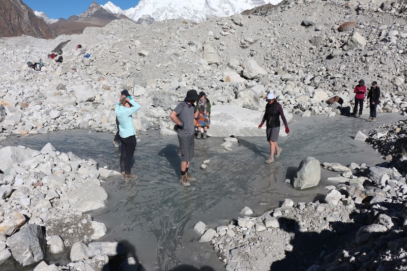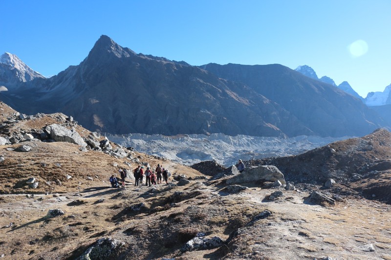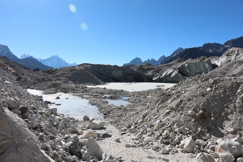 We left Gokyo early for our next destination, Thore. It was to be one of the longer days of the trek, with around 6 hours of walking. Upon leaving the Fitzroy Lodge, we traversed the glacier. It consisted of huge piles of rubble, the occasional ice wall and some frozen lakes. After discovering that the lakes were covered with thicccc ice, we proceeded to “ice skate” in our hiking boots for the next 30 minutes. We continued on our way, stopping for a picnic lunch of pasta, veggies, cordial and roti. The walk back down the valley afforded grandstand views of Dole and Machhermo which we had visited earlier in the trek. For most of the valley, Cho Oyu (an 8000m peak) was visible back towards Gokyo Ri. We eventually reached Thore, one of the more “rustic” lodges we had encountered. The afternoon was spent eating strawberry oreos, reading and yak-watching. Dinner was an egg curry and mixed vegetable soup, with a yummy dessert of chocolate-wheat pudding. After dinner we listened to music and relaxed, exhausted after a long day of walking, before heading off to bed.