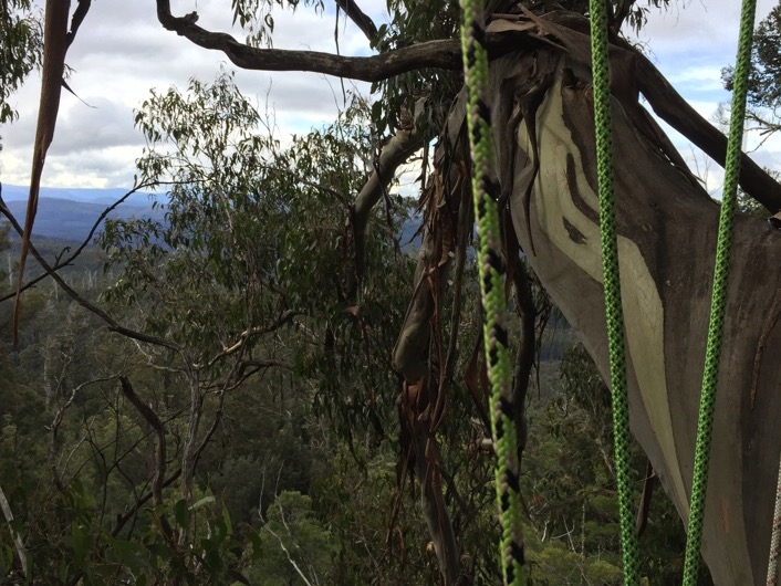 We had selected a Eucalyptus regnans that's about 20 meters down the bank from the forestry road where I'm camped. It has lots of epicormic shoots from low on the trunk which makes climbing easier.