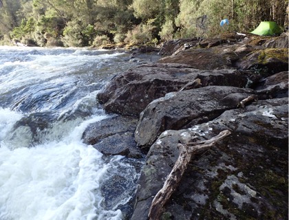 The hill steepened down to the riverbed with loose mossy rocks and lots of old fallen and rotting trees. I'd taken the paddle ends off the pack and was using them as walking sticks. At the river I've found an unlikely tent site perched on the rocks right beside a raging rapid. The noise is incredible. Tomorrow I just need to sneak around the river for a kilometre to reach Wayatinah. There's a mystery bird in the photos today that has been mentioned in an earlier post. Can you identify it? Sqwark!