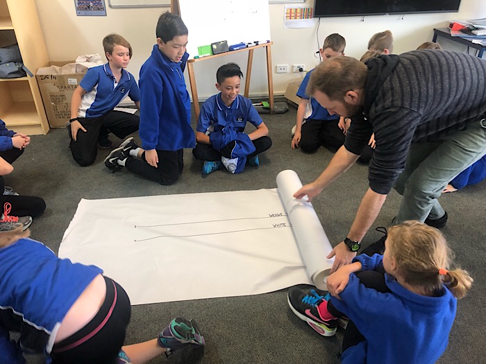 The class were in the middle of measuring and comparing wing spans of our two eagles when I poked my head around the door. The students had printed workbooks and have been doing some of the activities. But, and it’s pretty clear now, their highlight has been getting to know scientist and, yes I’ll make the call, emerging eagle superstar, James Pay.