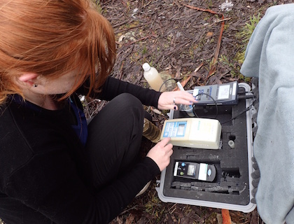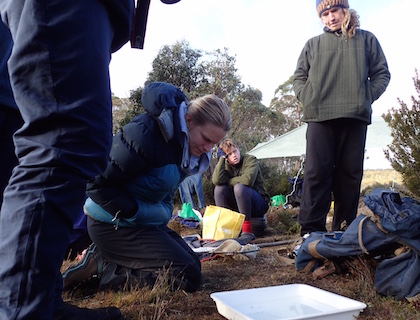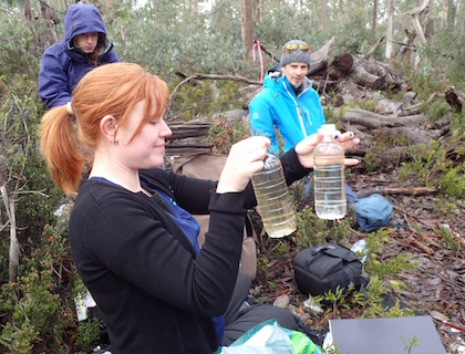 Anyone who left their boots outside the tents last night awoke to frozen laces as the temperature dropped to -1 degrees. But we couldn't sit around waiting for them to thaw out because Kate and John from Taswater were making a mighty effort to join us for some water quality testing. Taswater are responsible for supplying safe drinking water to many Tasmanians. If you're from other parts of Australia you probably have a similar organisation that makes sure you don't get sick from drinking the water that comes out your tap.