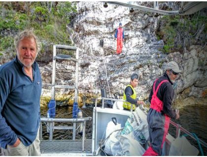 The last thing we did before anchoring for the night at Whalers Point was back the "Velocity" right up to the cliffs to get some more fresh water. There was a waterfall at this spot where some clever fishermen had rigged up a drum to catch the water and a hose to carry it out to a boat, ingenious! The only person who wasn't all that happy was poor old Harry who had to stand in the waterfall for 45 minutes.