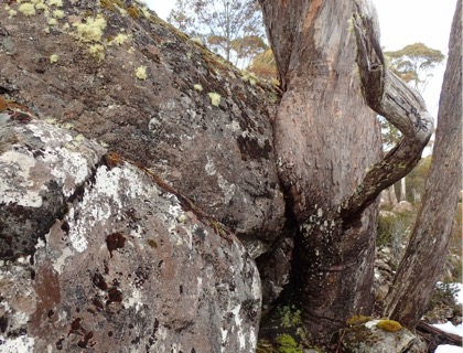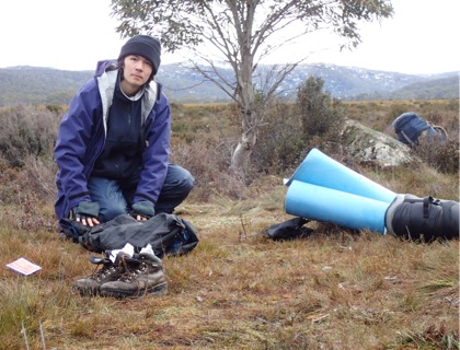Walking past the same cairn we noted a few days ago I crossed a swollen creek and began the solo part of this expedition. With no wind and no chattering teenagers it was eerily quiet. A wombat, dashing for freedom through the snow, broke the spell. There are no tracks here so navigating carefully is especially important. The main thing I'm trying to do is avoid thick scrub and steep hillsides. Especially south facing hills as the snow is much thicker and harder to get through on them. Can you guess why? I'd forgotten how hard slushy snow walking can be as I plunged knee deep into uneven ground step after step. A fleeting thought to turn back crossed my mind but conditions improved and I made good progress by the day's end.