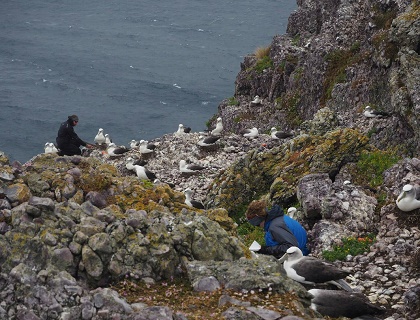 A warm and cosy night... and quiet. Until about 10.30pm when the penguins started up. Two little penguins near my tent had an animated discussion while the prions chattered away on their nests. What a great sound to fall asleep to. It dawned overcast and rainy. So we put off any work until the weather was a bit kinder. Mid morning we were in north colony checking for breeding success. I was recorder of information again as Kris walked through the colony and Julie chased the Golden Poo. Once again an amazing experience walking amongst the albatross and seeing the chicks at close range. By midday we were done so we sat watching for fresh poo for Julie. There is an art to watching for a bird to poo. They stand up, shake a tail feather then shoot a poo out. Julie nearly got a trifecta, both parents and chick. She is researching the DNA in the faeces of the Shy Albatross. Julie analyzes the poo to find out what the albatross are eating and can even work out specific species of fish eaten through the DNA.