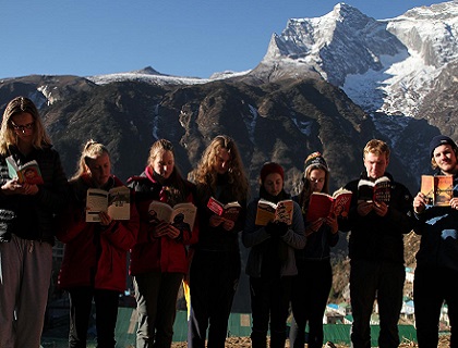 Books don’t just inspire us to seek out experiences for ourselves; they help us to connect to one another. I’ve listened in to a number of conversations (invited and uninvited) on the plane, waiting in various airports, along the trail and sitting around at meal times. “What are you reading?” “Is it good?” “I love that book!” “Can I read it once you’ve finished?” Our disparate group: students from four different schools, a doctor and a teacher; all finding common ground based on the written word. And it is not unique to our group. Books and adventure are extrinsically linked. Everywhere we go we see travellers reading, every teahouse and lodge has a collection of well-worn books, waiting patiently for the next person to come along, open the pages and escape into a different time and place. Even on this expedition, as we engage in a once-in-a-lifetime experience, we will go to bed and for ten of fifteen minutes before we fall asleep each of us will leave Nepal and travel to some other place or time. But it is not escapism, rather I like to think of it as an adventure within an adventure.