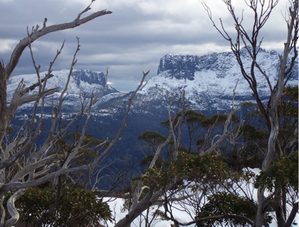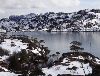 Double phwoar this morning with minus six degrees on the thermometer. But with my lesson learnt from the previous morning I had brought my boots and water bottle inside the tent and they were only a little bit frozen. The snow had iced over nicely and walking was slow but easy as I picked my way from highland lake to lake. The eucalyptus trees up here are snow gums. There are also pencil pines, deciduous beech, pandani (sometimes called grass trees) and lots of other alpine plants. Many of these species do not grow at lower altitudes.