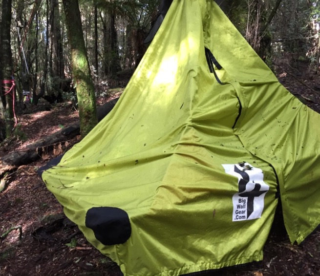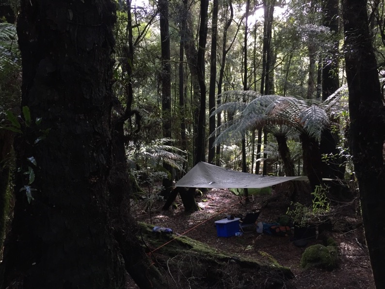 In the early morning darkness I lay in the 'ground house' and listened to the noises of the forest. A distant clap of thunder, rain drops on the roof, a currawong and a kookaburra warbling and a faint cough coming from Yoav's tent. The darkness lasted a lot longer under the heavy foliage than in an open forest. After a hot drink and cold oats for breakfast we went searching for the tree to hang our house from.