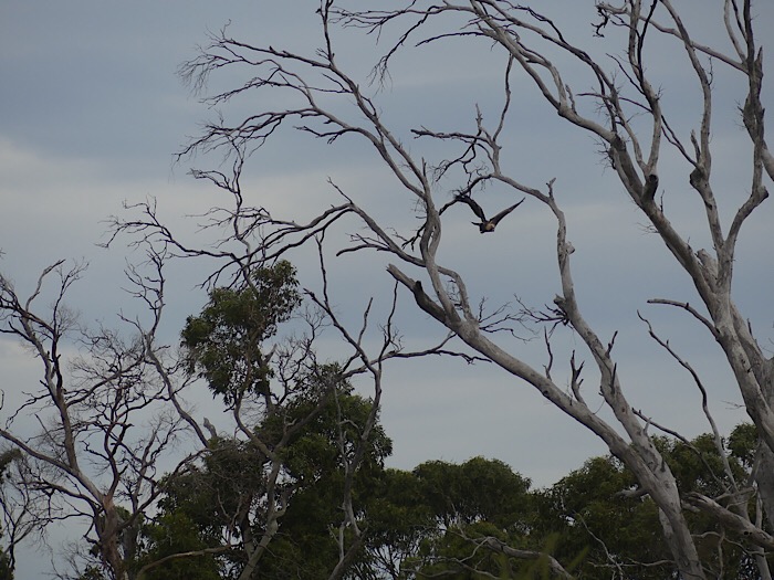 It far down the track James spotted an eagle perched in a dead tree. It was Ernie. When he flew away we could see the light coloured feathers of a young bird. It was confirmed soon afterwards when two more eagles came into view, soaring up high. Ernie’s parents. Wow!