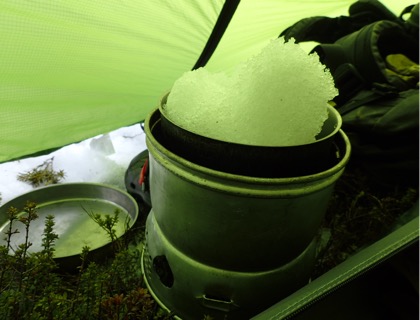 My journey as a human raindrop started early with the cloud blowing around the tent and the rocks frosty with overnight ice. As a raindrop my main mission in life is to go downhill and find other raindrops. This was sometimes easy and sometimes hard as the steep dolerite rocks funneled into crevices full of snow and ice. With gravity on my side I tumbled onwards, mostly in control, and did indeed find little watery mates along the way. Some crept into my boots and some went down the back of my neck.