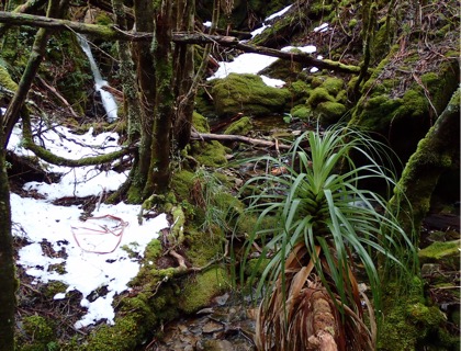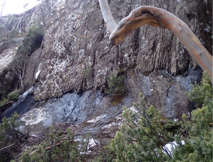 The rocks eventually gave way to thick mats of Bauera (a hardy creeping plant) and larger alpine yellow gums. You can see in one photo where I passed the contact or meeting point of dolerite (on top) and sedimentary rock (on the bottom). The slope became gentler and the trees closed in overhead so that the forest floor was open and green mosses and epiphytes covered trunks of old myrtles.